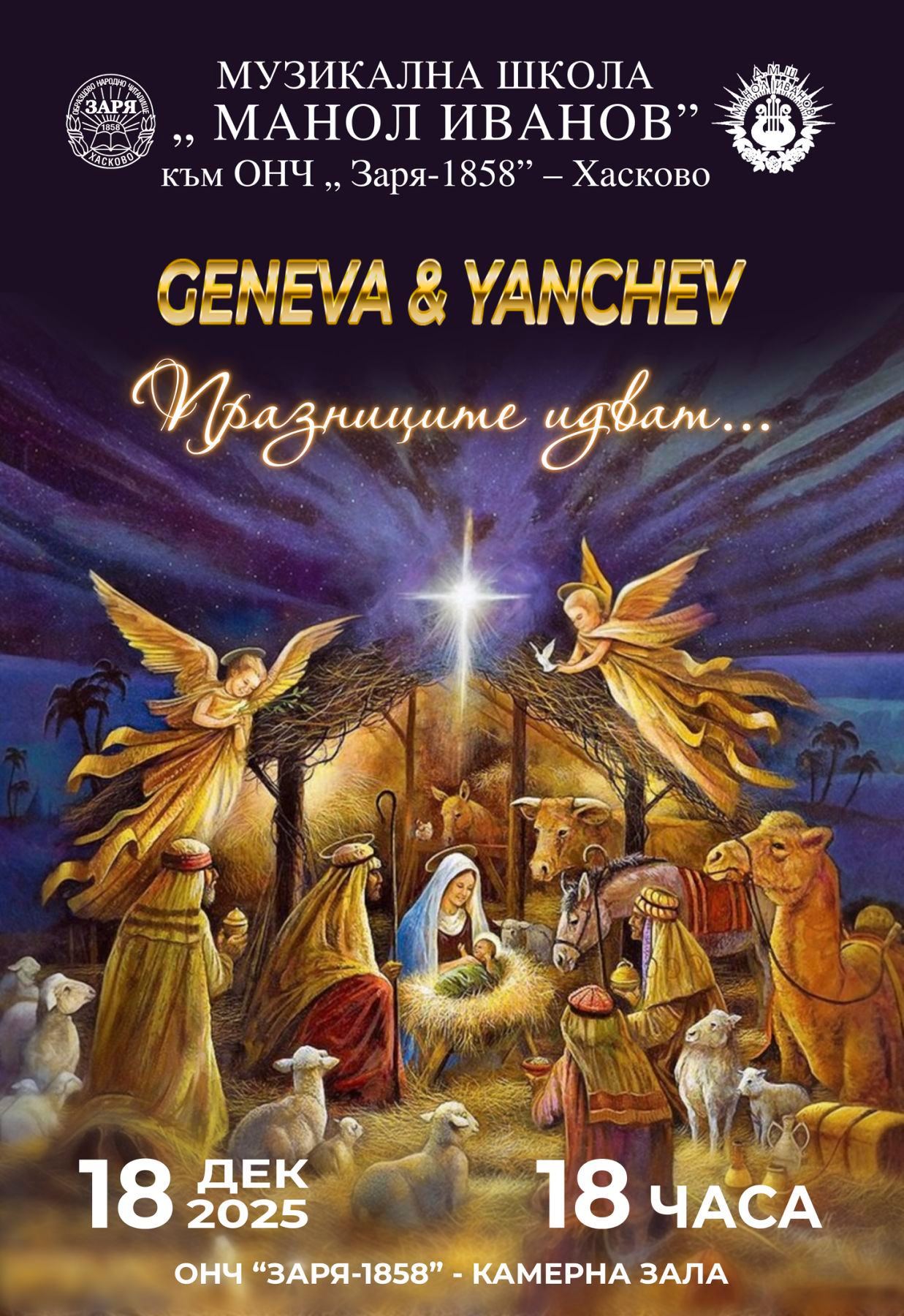 04 дек. „Празниците идват“ 18.12.2025 г от 18:00 ч. ОНЧ „Заря – 1858″ – Хасково, Камерна зала Geneva & Yanchev представят „Празниците идват…“ – музикална продукция 0